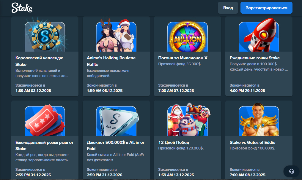 - Текущие акции и турниры. Stake.com регулярно проводит разнообразные акции, такие как еженедельные розыгрыши и тд.